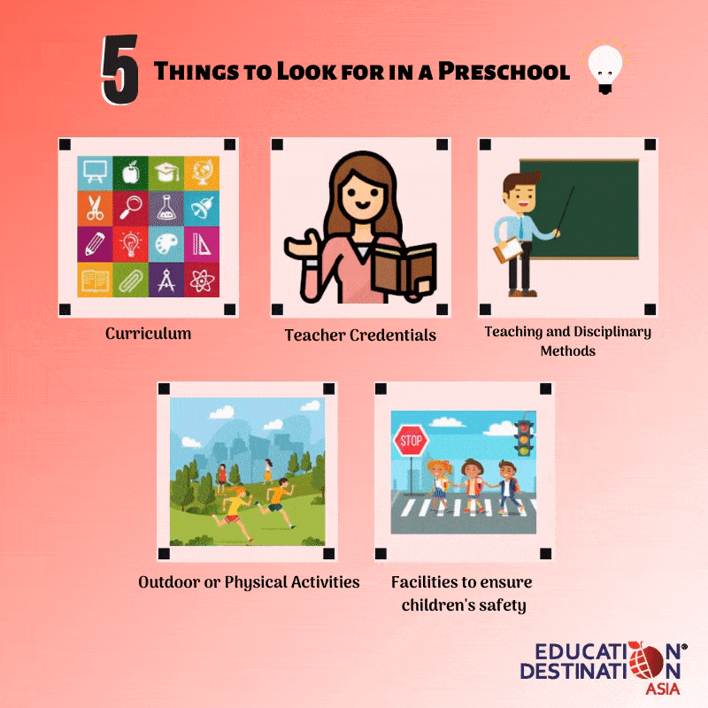 Other factors when searching for a preschool are location, fees and meal plans. Most importantly, make sure it is the right time for your child to enter preschool looking at his age, maturity and sociability levels.