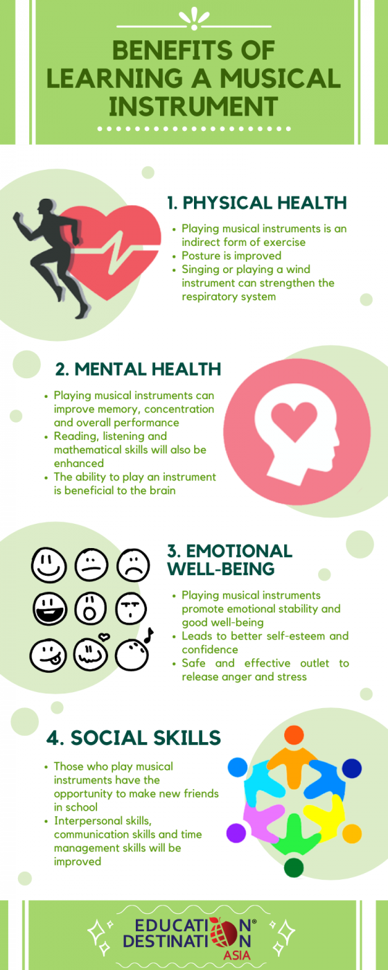 Learning music has many benefits in terms of mental and physical well-being. Here are some benefits of being able to play a musical instrument!